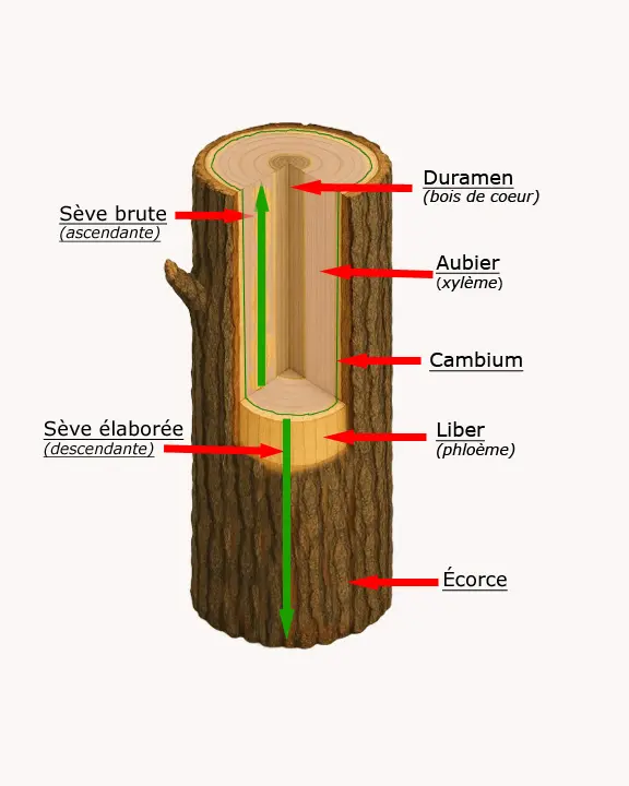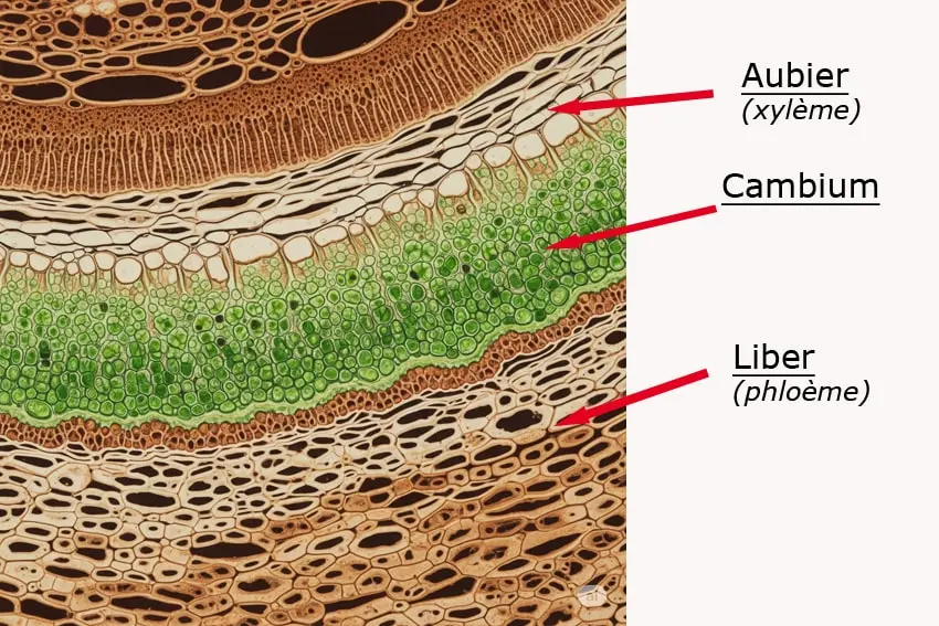 - Le Cambium : Cette fine couche de cellules, située juste sous l’écorce, représente le cœur de la croissance de l’arbre. C’est là que se forment les nouvelles cellules du xylème et du phloème. Le xylème transporte l’eau, les nutriments des racines vers les feuilles. Le phloème transporte les sucres produits par la photosynthèse des feuilles vers le reste de l’arbre. Une coupe nette, précise, est essentielle. Elle ne doit pas endommager cette couche vitale. Elle garantit ainsi la circulation ininterrompue de la sève.