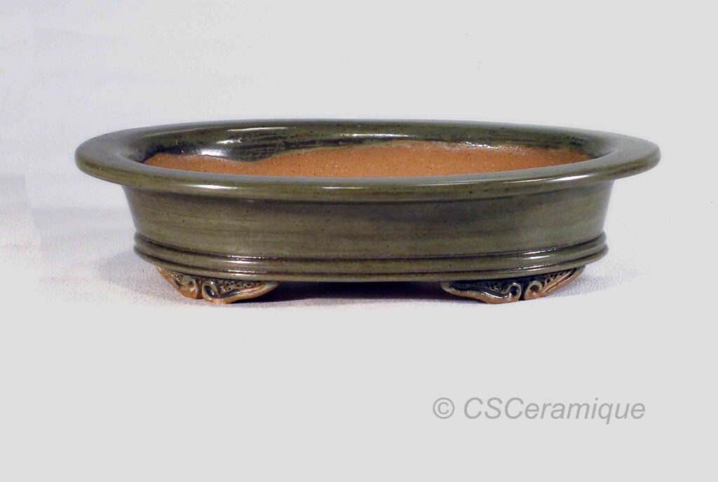 Ce pot a été fabriqué en grès beige avec une glaçure vert antique.