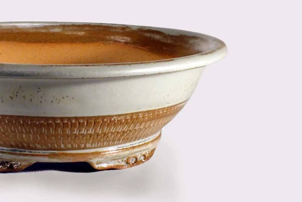 Ce pot a été fabriqué en grès beige avec une glaçure aqua et brune. C’est un pot qui est du genre » féminin » par sa forme, sa texture et ses pieds sculpté.